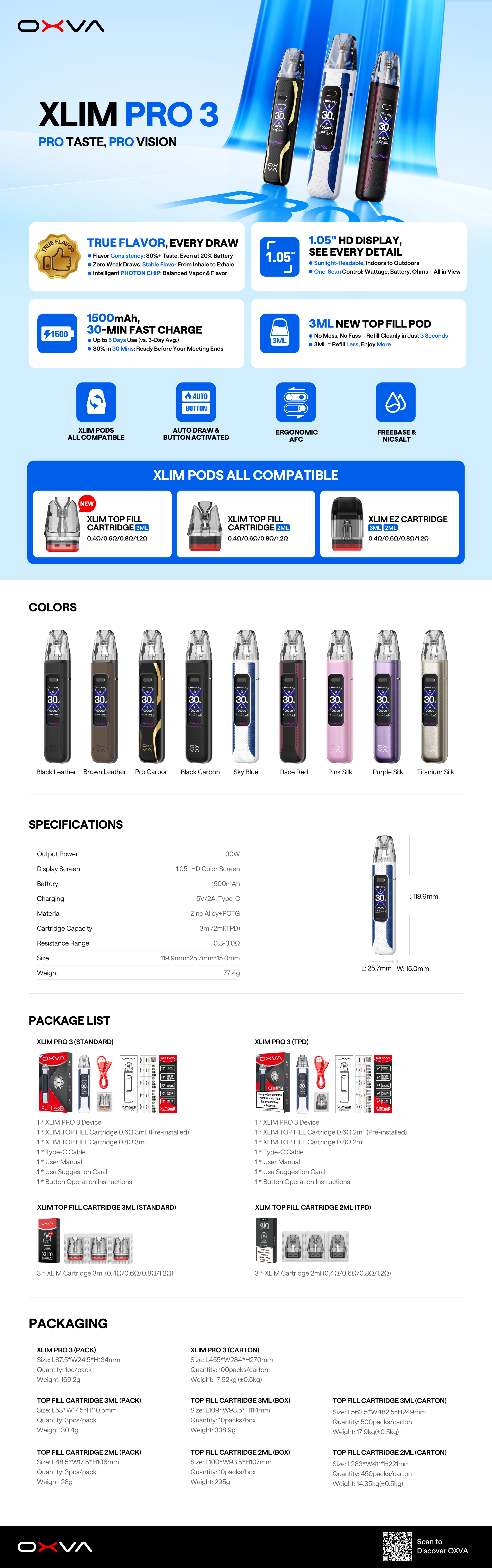 The **OXVA XLIM Pro 3** is a high-performance pod vape built for consistent flavor and ease of use. It features a powerful 1500mAh battery with fast Type-C charging, a 1.05-inch HD color screen, and OXVA’s advanced Pulse System for smooth, stable output. With a 3ml top-fill pod, adjustable airflow, and up to 30W power, it delivers a reliable and customizable vaping experience for everyday users.