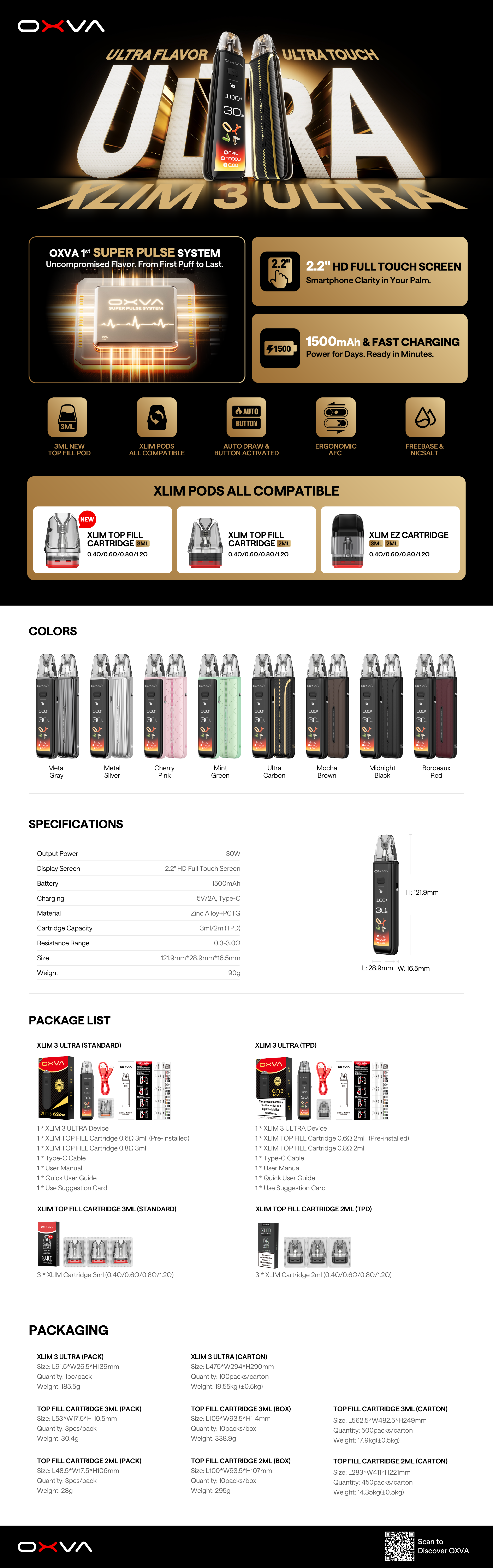 The OXVA XLIM 3 Ultra is a premium pod vape designed for smooth flavor and modern usability. It features a powerful 1500mAh battery with fast charging, a large 2.2-inch full touch screen, and OXVA’s Super Pulse technology for consistent performance. With adjustable airflow, top-fill pods, and compatibility with all XLIM cartridges, it delivers a customizable and user-friendly vaping experience for both beginners and experienced users.
